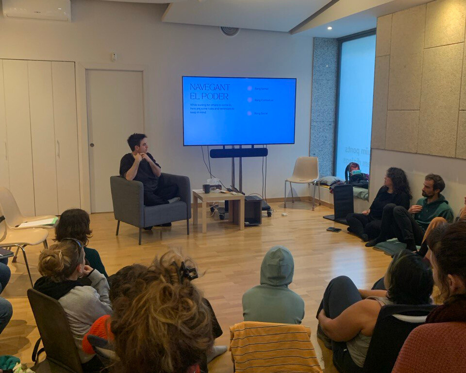 Aquest 2025 també hem dit adeu a 4 estudiants que han acabat els estudis: el Simó, l'Amaia, el Xoán i l'Ari. Precisament, l'Ari ens va visitar per presentar el seu treball final. Compartint l'espai amb Irene i Anuk, ens han portat grans reflexions sobre la pràctica del rol de la facilitació.